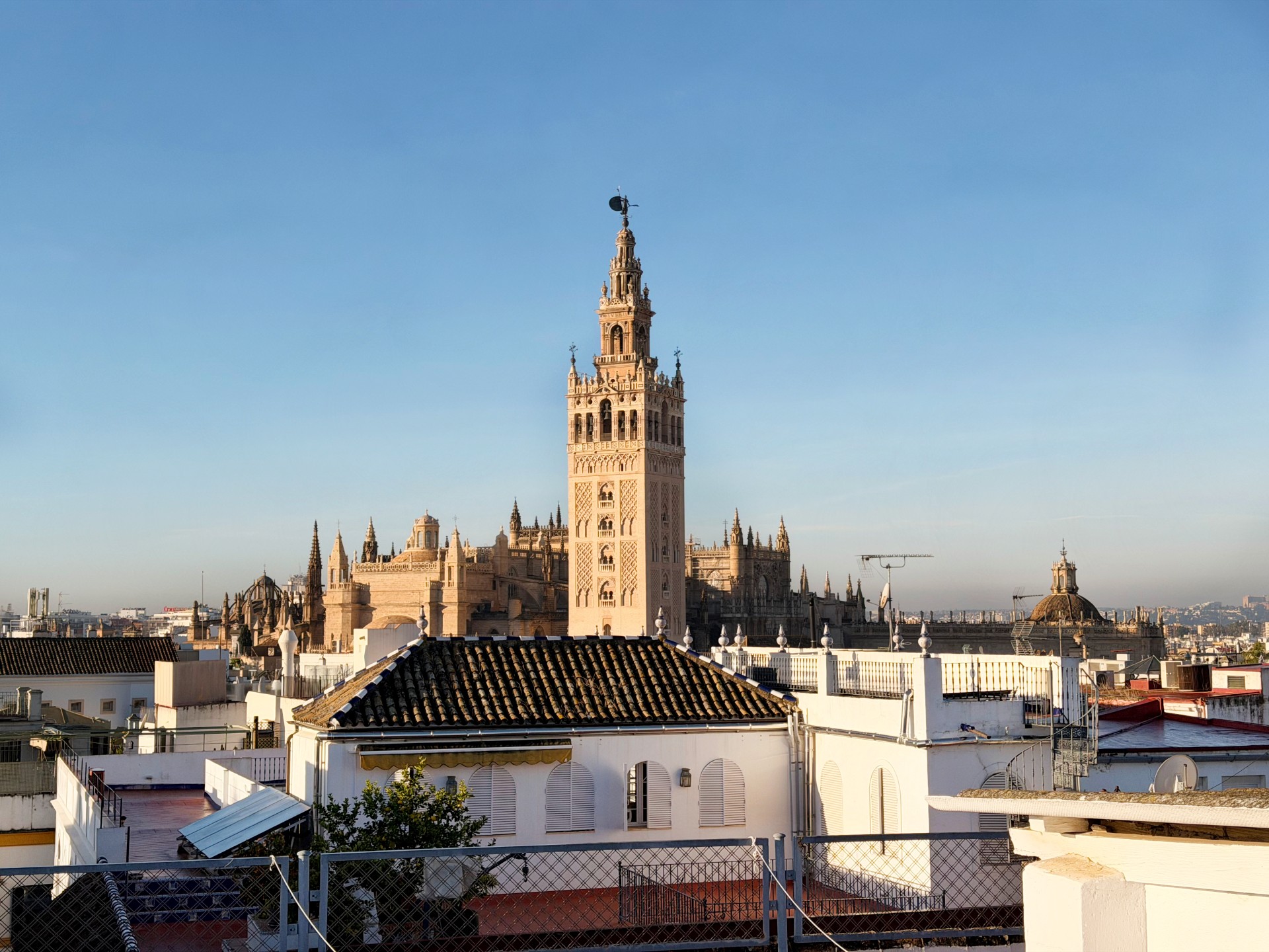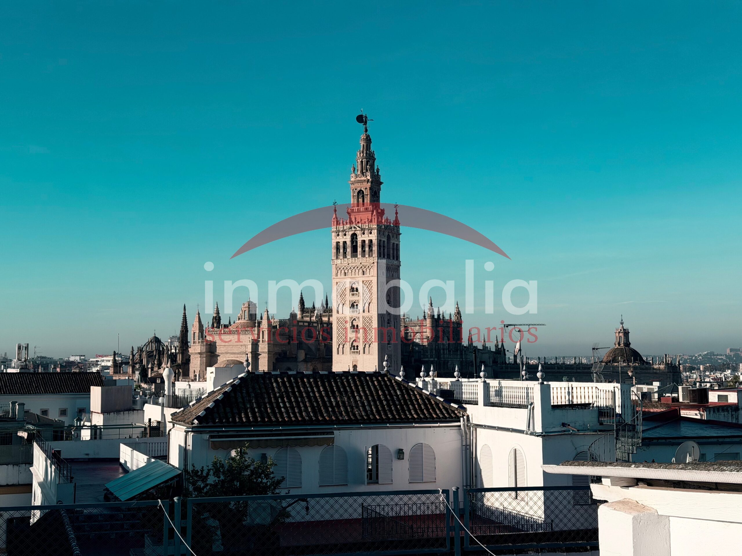 La azotea, uno de los grandes atractivos de la propiedad, ofrece vistas panorámicas de toda Sevilla, permitiendo contemplar el perfil histórico de la ciudad y disfrutar de atardeceres únicos sobre sus tejados y monumentos.